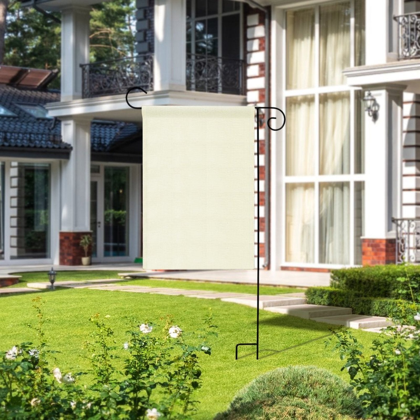 Ahora, imagina una bandera que parece haber nacido en tu jardín. Una pieza hecha de lino, con su textura rica y terrenal, que se mueve con el viento de una forma que complementa, no compite, con el movimiento de las hojas. Y sobre ese lienzo natural, tu firma: un diseño botánico que dibujaste, el nombre de tu "Rancho", o un simple "Bienvenido" en una tipografía elegante. Ya no es un adorno; es una extensión de tu jardín. Una pieza de arte que se siente tan orgánica como las flores que la rodean.