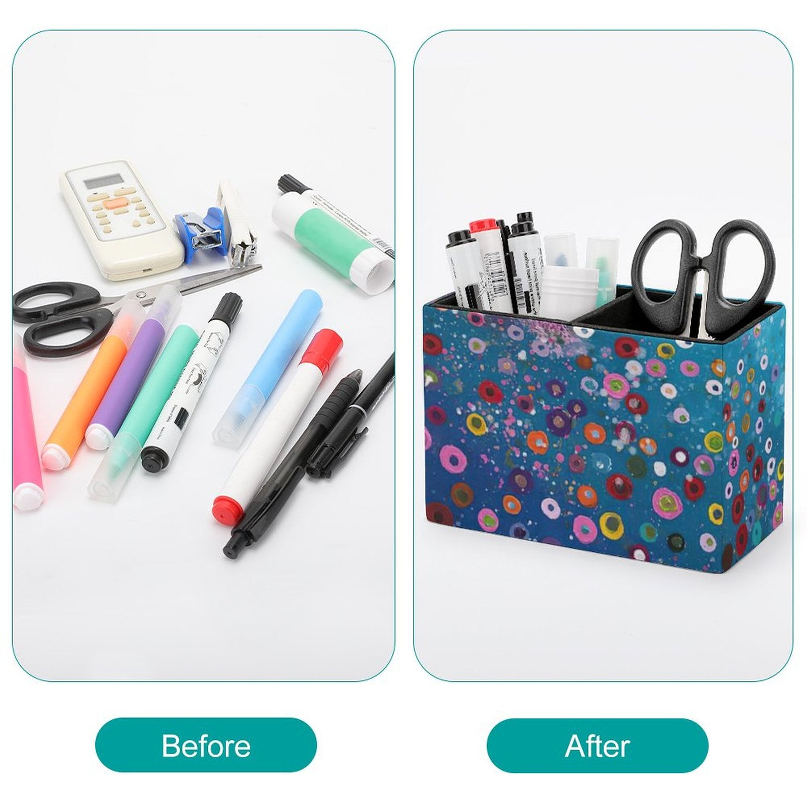 Su diseño rectangular y espacioso va más allá de un simple portalápices. Es una estación de organización multifuncional. Su generoso interior te permite clasificar y separar, creando un sistema intuitivo donde todo tiene su lugar: