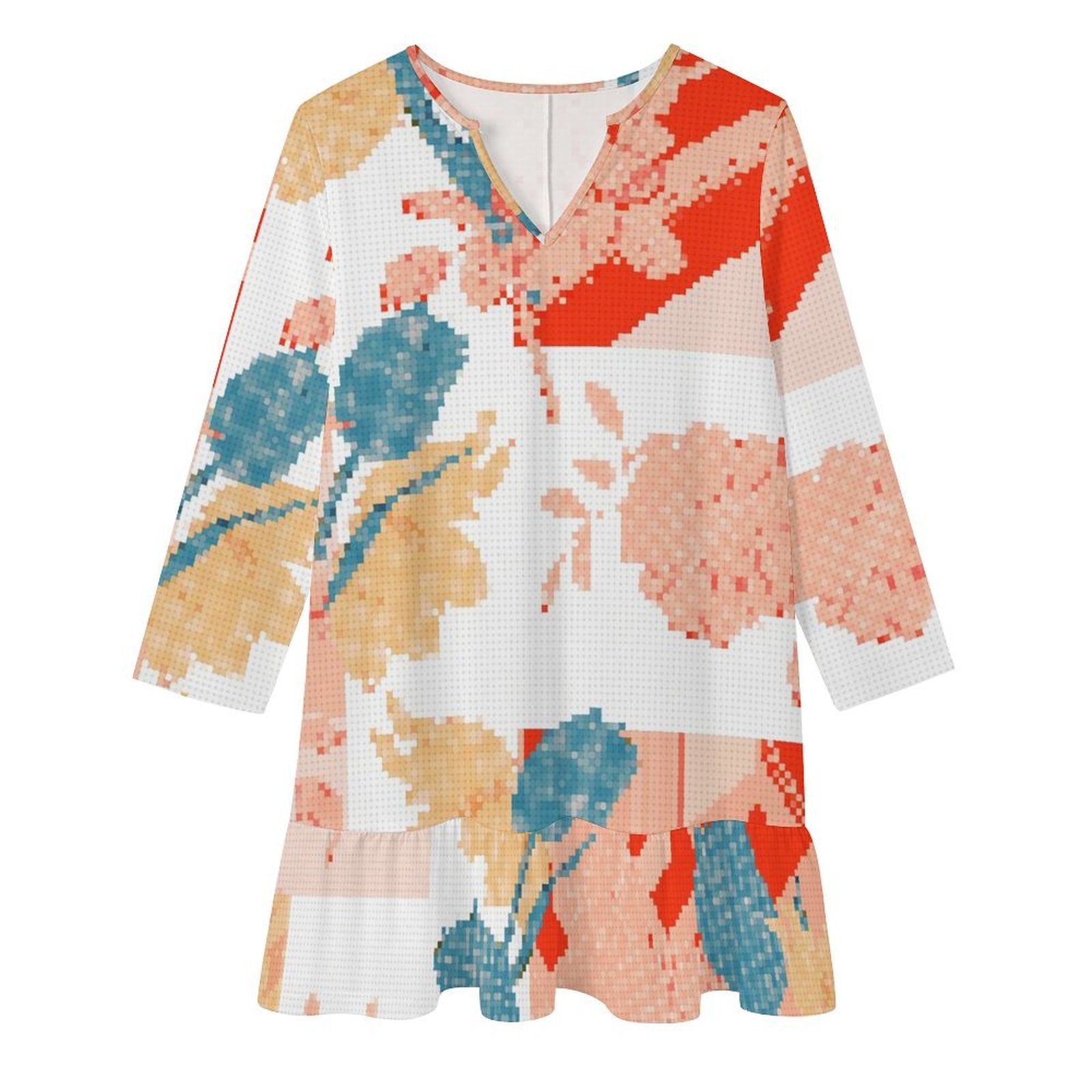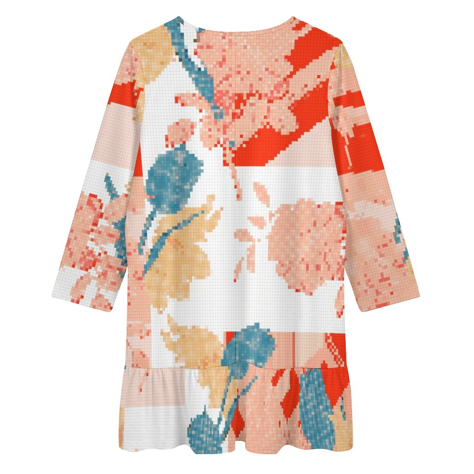 Cada elemento de este vestido está pensado para favorecer y darte confianza. El elegante cuello en V alarga la silueta, mientras que las mangas largas le dan un toque de sofisticación. El detalle estrella es el delicado volante u olán en el bajo, que añade un movimiento coqueto y un acabado que estiliza la figura, creando una apariencia más esbelta y fluida.