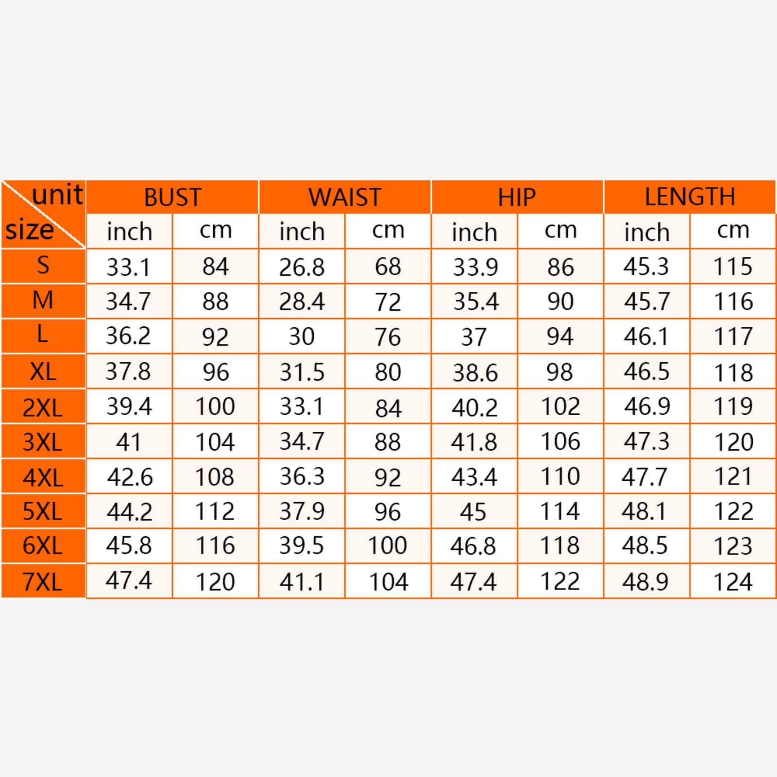 7XL | 120 / 47.4 | 104 / 41.1 | 122 / 47.4 | 124 / 48.9 |